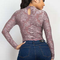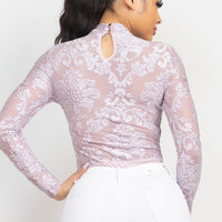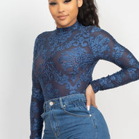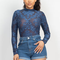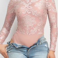 A long sleeve velvety bodysuit in solid color featuring an all-over embroidered details, mock neckline, back keyhole with double button closure, and a snap button closure.